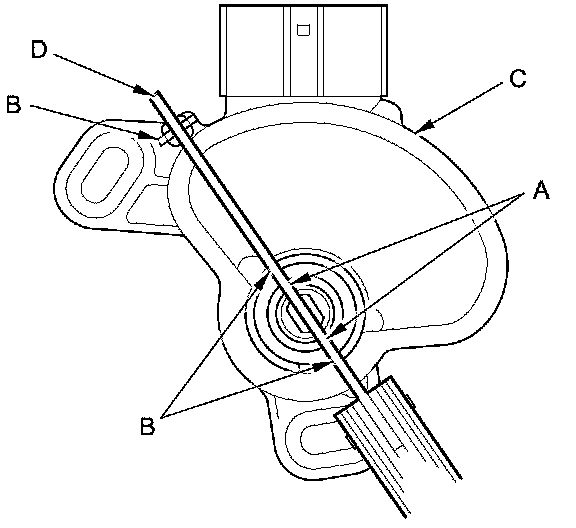 28. Align the cutouts (A) on the rotary-frame with the neutral positioning cutouts (B) on the transmission range switch (C), then put a 2.0 mm (0.08 in) feeler gauge blade (D) in the cutouts to hold the switch in the N position.