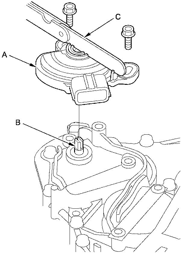 29. Install the transmission range switch (A) gently on the selector control shaft (B) while holding it in the N position with the 2.0 mm (0.08 in) blade (C).