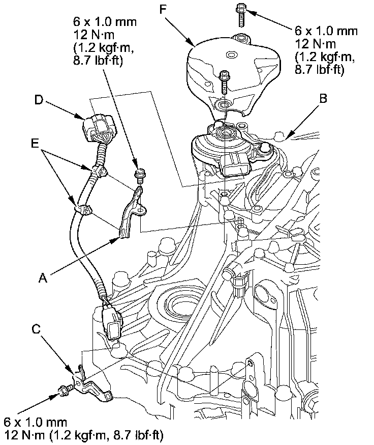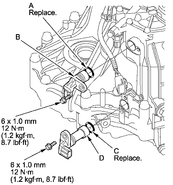 36. Install a new O-ring (C) on the output shaft (countershaft) speed sensor (D), then install the output shaft (countershaft) speed sensor.