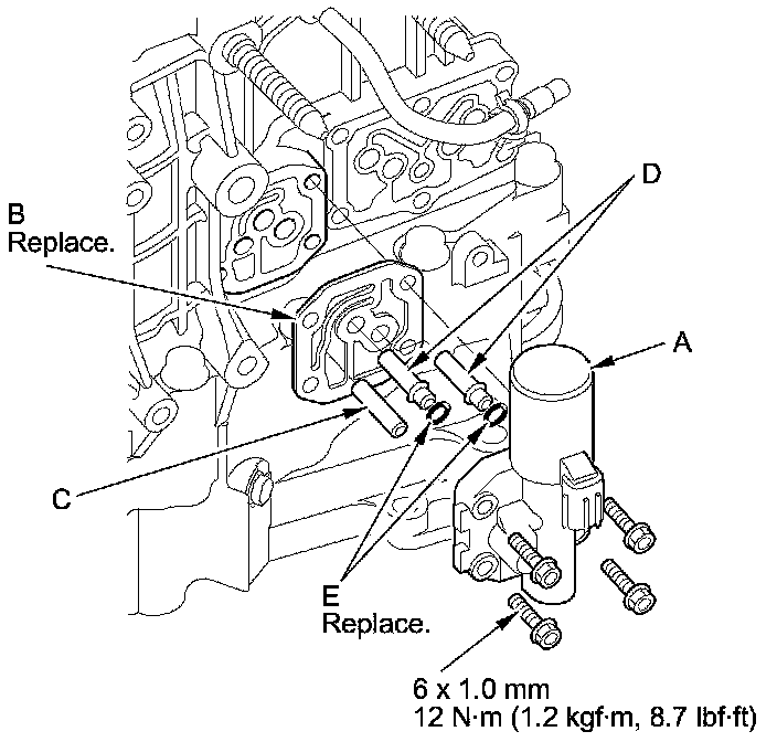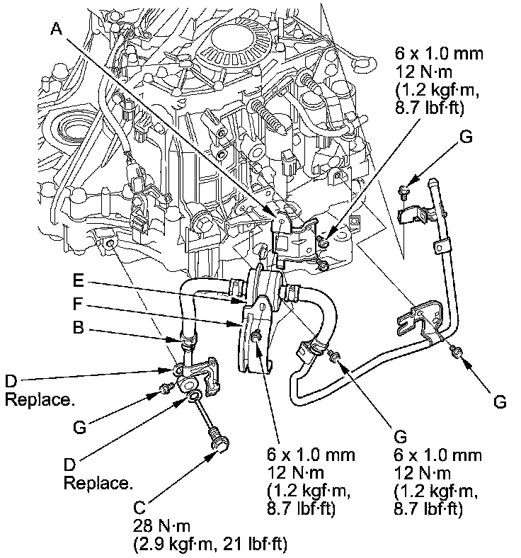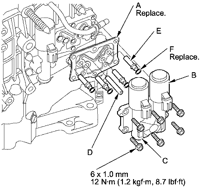 40. Install the ATF pipe (D) and the ATF joint pipes (E), and install the new O-rings (F) over the ATF joint pipes.