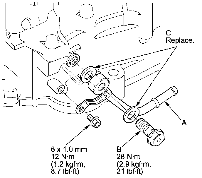 42. Install the ATF outlet line (A) on the torque converter housing, and secure it with the line bolt (B) and new sealing washers (C).