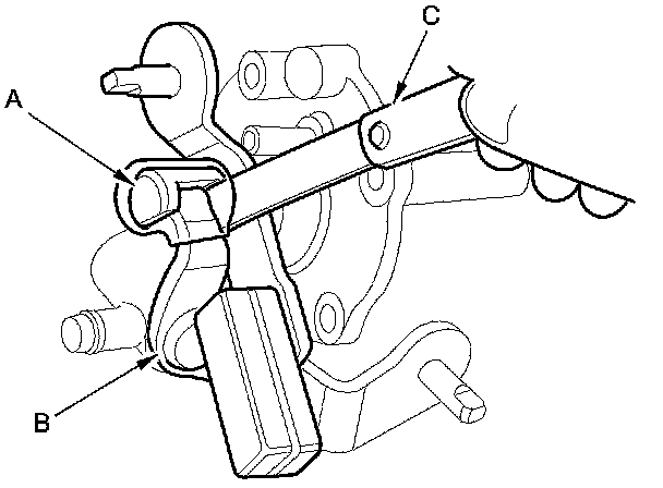 1. Measure the clearance between the change lever (A) and the select lever (B) with a feeler gauge (C). If the clearance is more than the service limit, go to step 2.