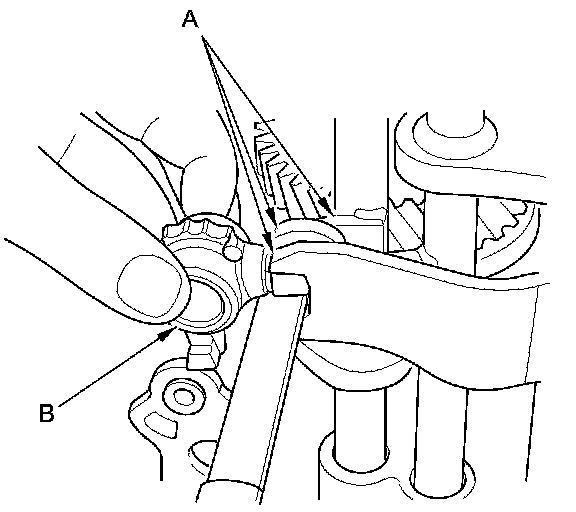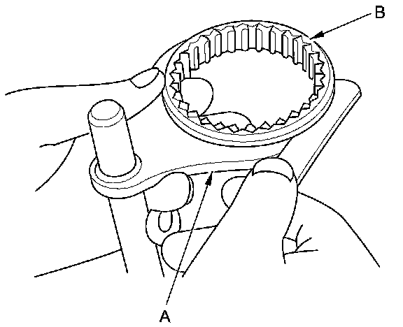 1. Measure the clearance between each shift fork (A) and its matching synchro sleeve (B). If the clearance exceeds the service limit, go to step 2.