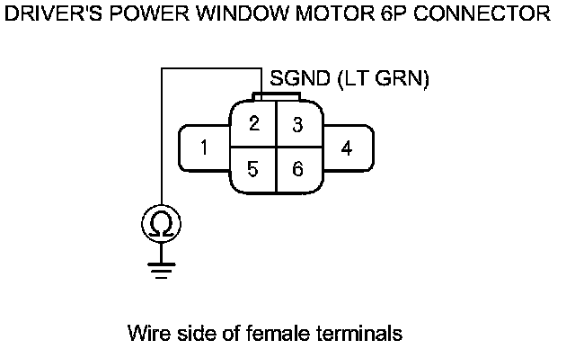 8. Check for continuity between the driver's power window motor 6P connector terminal No. 2 and body ground. There should be continuity.