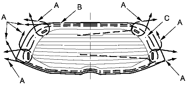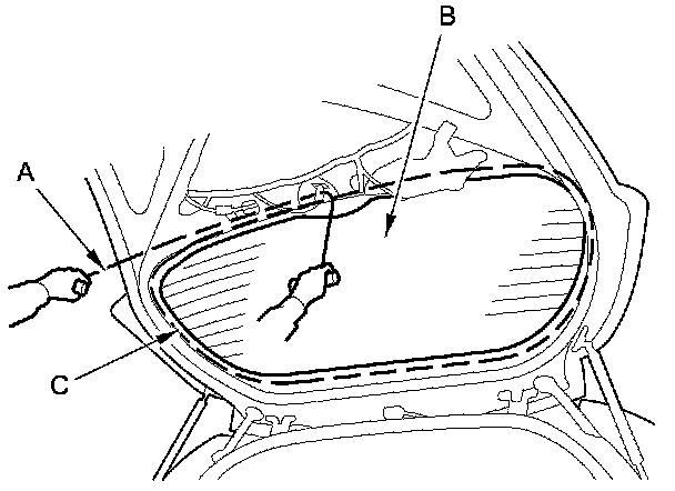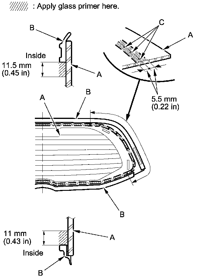 11. Apply glass primer to the inside face of the rear window (C) as shown, and let the primer dry, then attach rubber dams A and B with adhesive tape to the inside face of the rear window.