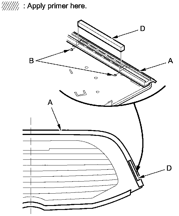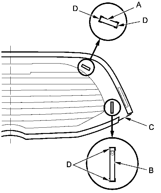 - Apply the glass primer to both side portions of the rear window, using the printed dots (C) on the rear window as a guide.