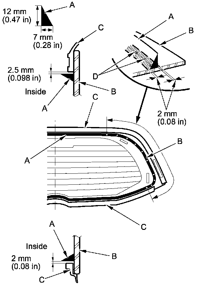 20. Put the cartridge in a caulking gun, and run a continuous bead of adhesive (A) around the edge of the rear window (B) and along the rubber dams (C) as shown. Apply the adhesive to both side portions of the rear window, using the printed dots (D) on the rear window as a guide. Apply the adhesive within 30 minutes after applying the glass primer. Make a slightly thicker bead at each corner.
