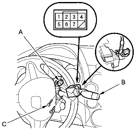 3. Turn the steering wheel to access the wiper/washer switch screws (C).