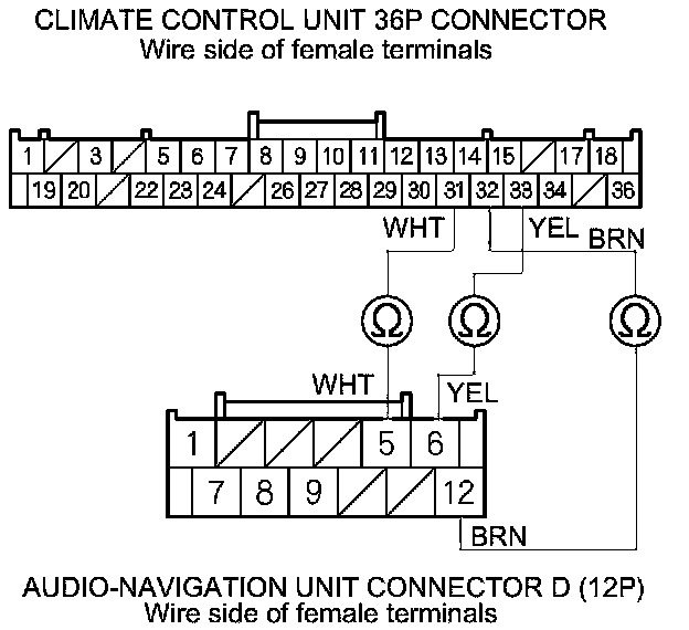 6. Check for continuity between the following terminals of climate control unit 36P connector and audio-navigation unit connector D (12P).