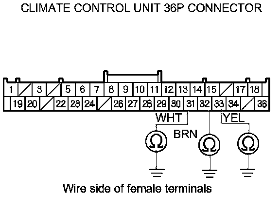 7. Check for continuity between body ground and climate control unit 36P connector terminals No. 31, No. 32, and No. 33 individually.