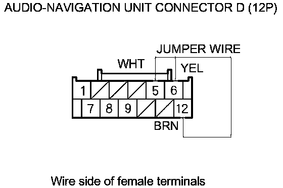 9. Connect audio-navigation unit connector D (12P) terminals No. 5, No. 6, and No. 12 with jumper wires.