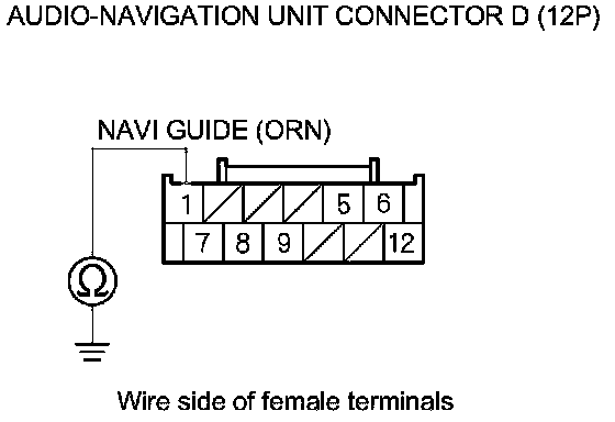 7. Check for continuity between audio-navigation unit connector D (12P) terminal No. 1 and body ground.