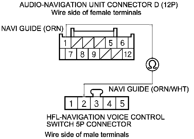 8. Check for continuity between audio-navigation unit connector D (12P) terminal No. 1 and HFL-navigation voice control switch 5P connector terminal No. 2.