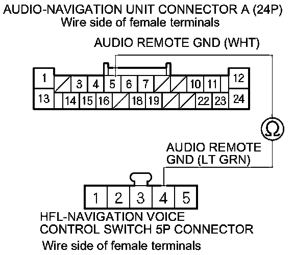 10. Check for continuity between audio-navigation unit connector A (24P) terminal No. 5 and HFL-navigation voice control switch 5P connector terminal No. 4.