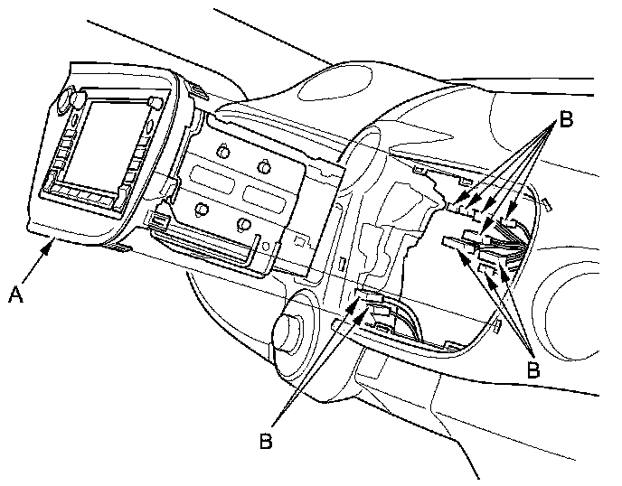 12. Remove the audio-navigation unit (A) from the center panel (B).