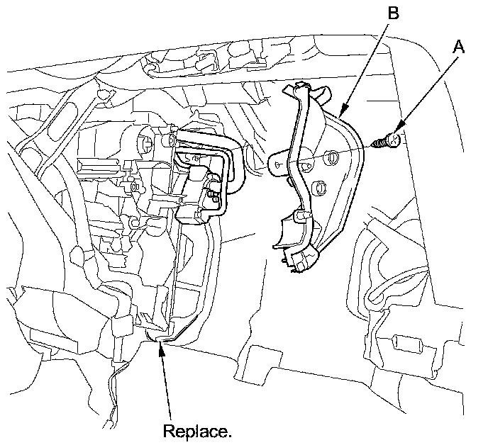4. Remove the bolt, then disconnect the A/C line (B) from the evaporator core and remove the O-rings (C).