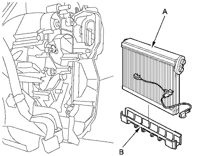 10. Carefully pull out the evaporator core assembly (A), then remove the plate (B).