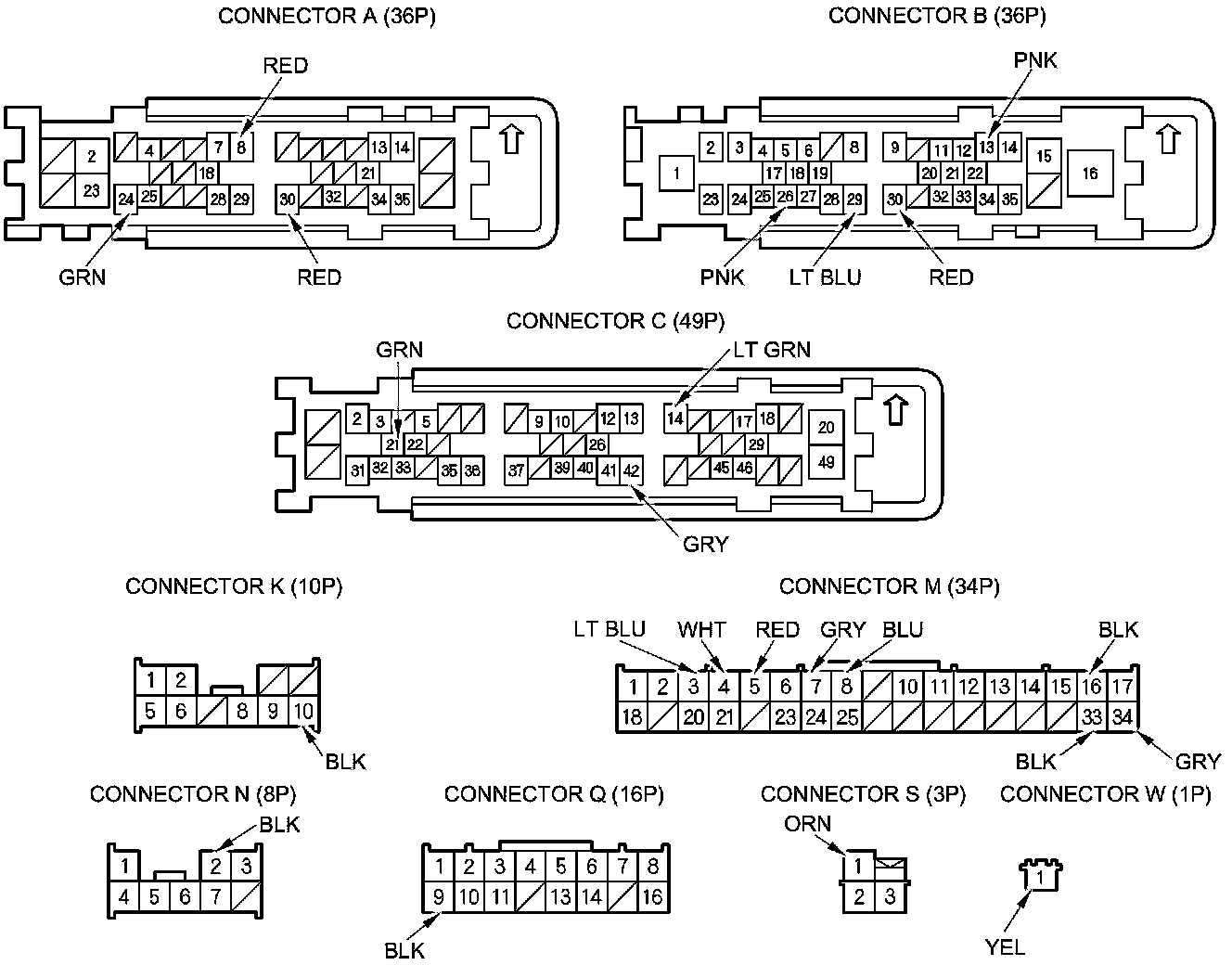 3. Disconnect under-dash fuse/relay box connectors A, B, C, K, M, N, Q, S, and W.