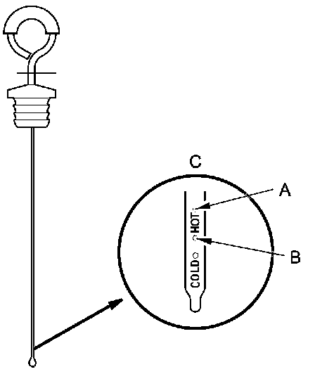 5. Remove the dipstick, and check the CVT fluid level. It should be between the upper mark (A) and the lower mark (B) on the HOT level in tip of the dip stick (C).