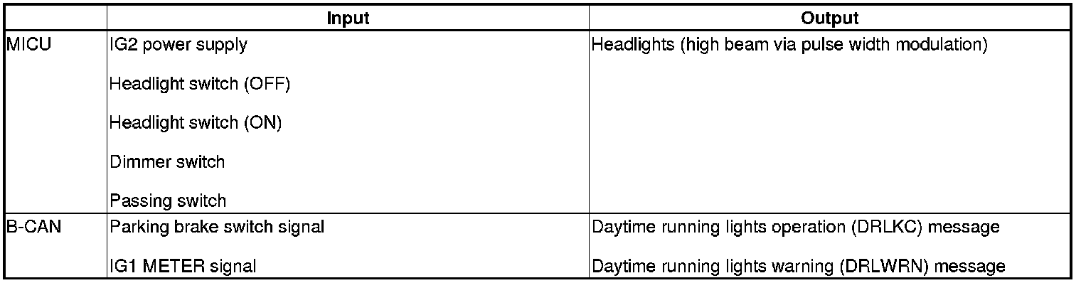 The MICU control of the headlights as daytime running lights is based on inputs from each switch and B-CAN data.