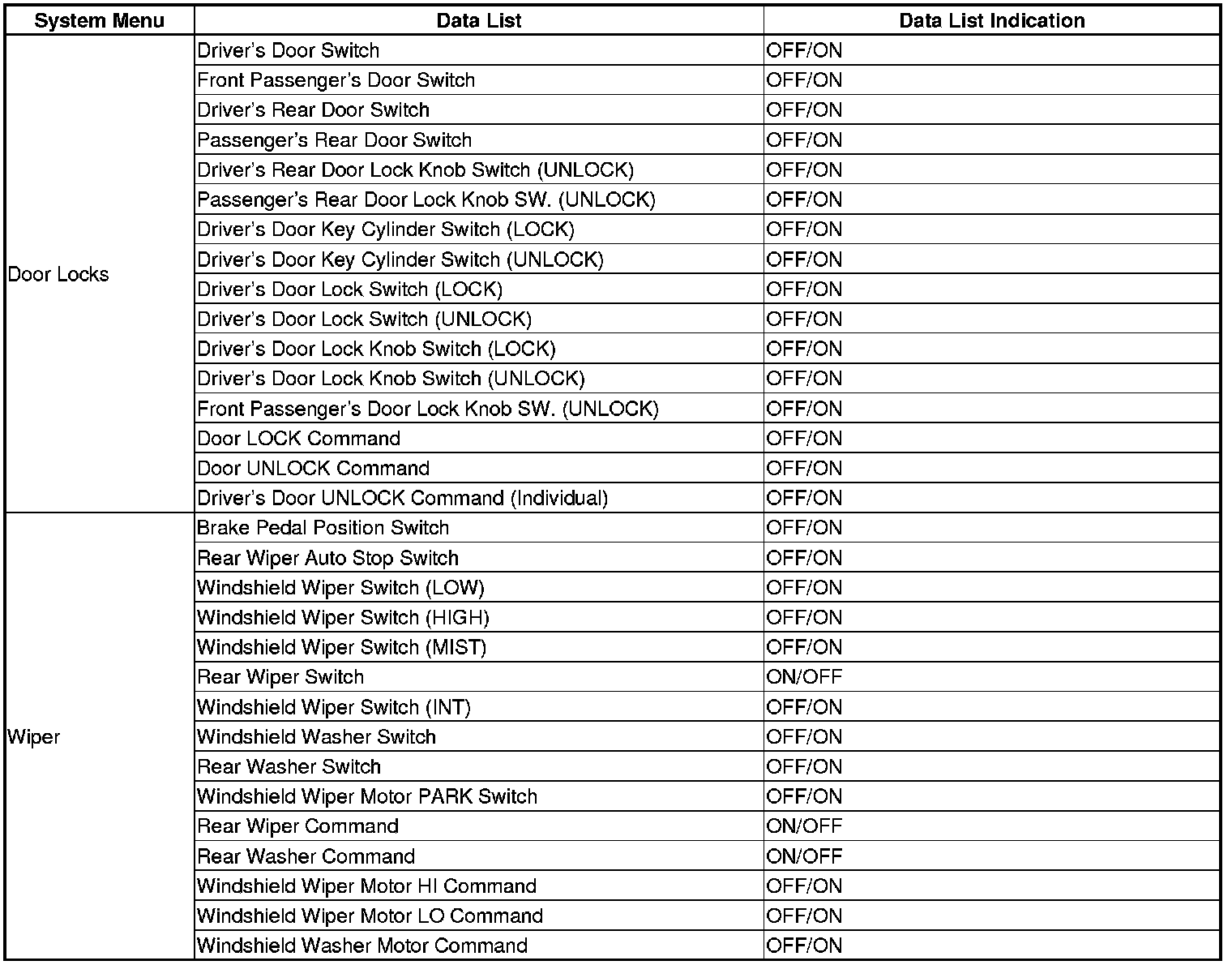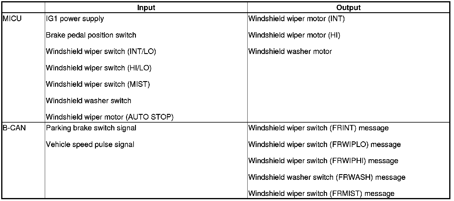 The MICU control of the windshield wiper motor and the windshield washer motor is based on inputs from each switch and B-CAN data.