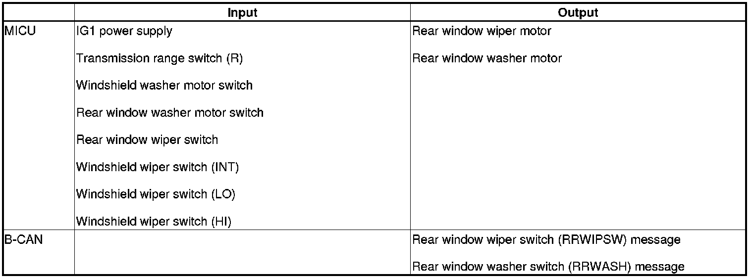 The MICU control of the rear window wiper motor and the rear window washer motor is based on inputs from each switch.