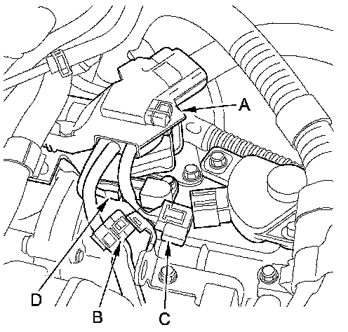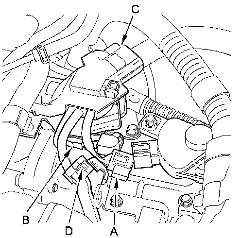 18. Connect the transmission range switch connector (C), and the CVT output shaft (driven pulley) speed sensor connector (D).