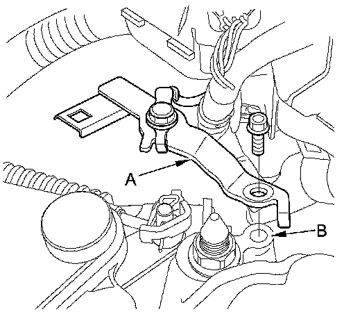 5. Remove the ground terminal bracket (A) from the transmission mount (B).