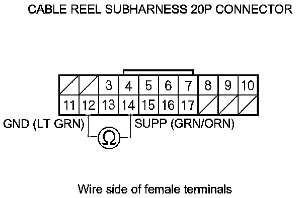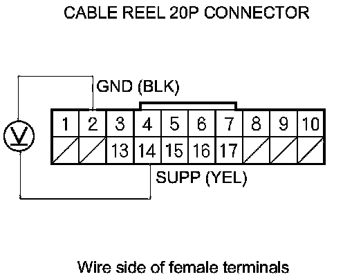 9. Measure the voltage between cable reel 20P connector terminals No. 2 and No. 14.