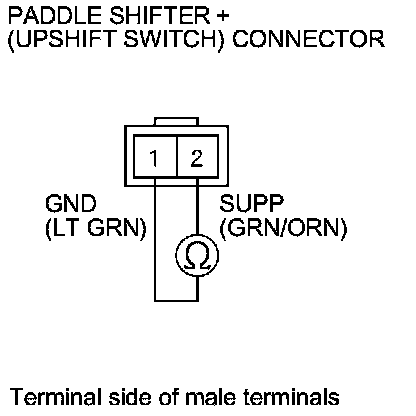 4. Check for continuity between paddle shifter + (upshift switch) connector terminals No. 1 and No. 2 when pressing and releasing the paddle shifter + (upshift switch).
