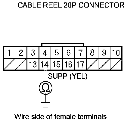 7. Check for continuity between cable reel 20P connector terminal No. 14 and body ground.