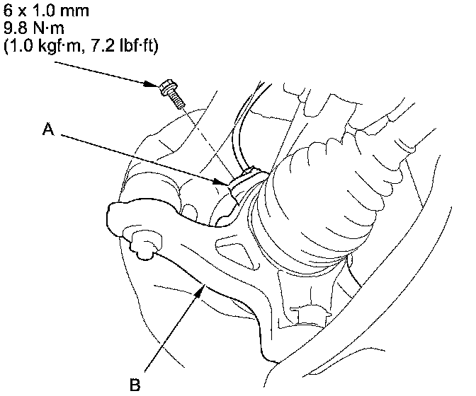 8. Remove the wheel speed sensor (A) from the knuckle (B). Do not disconnect the wheel speed sensor 2P connector.