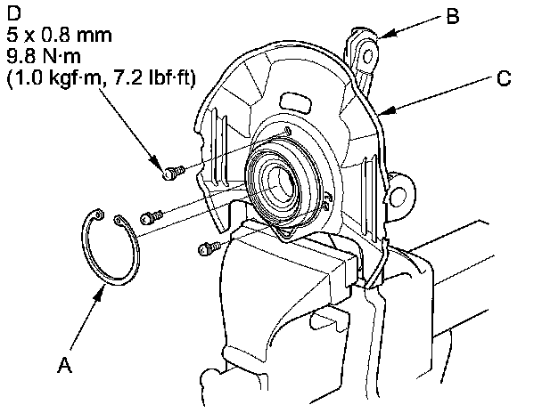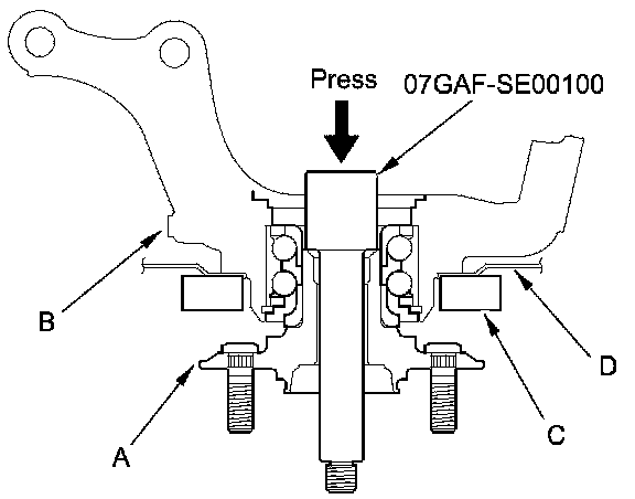 1. Separate the hub (A) from the knuckle (B) using the hub dis/assembly tool and a hydraulic press. Hold the knuckle with the attachment (C) of the hydraulic press or equivalent tool. Be careful not to damage or deform the splash guard (D). Hold onto the hub to keep it from falling when pressed clear.