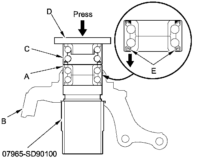 6. Press a new wheel bearing (A) into the knuckle (B) using the old bearing (C), a steel plate (D), the support base, and a press.