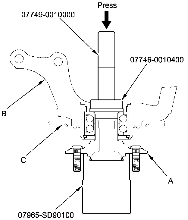 9. Install the hub (A) onto the knuckle (B) using the attachment, the driver handle, the support base, and a hydraulic press. Be careful not to damage the splash guard (C).