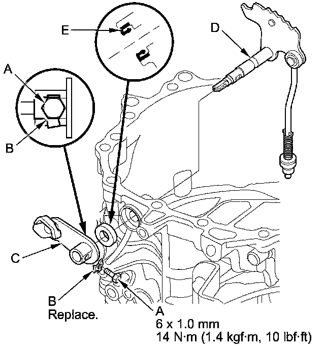 3. Check for fluid leaks between the transmission housing and the oil seal (E). If there is a fluid leak, replace the oil seal with a new one.