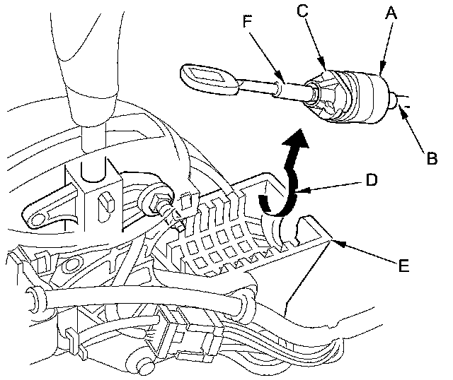 5. Rotate the socket holder (A) on the shift cable (B) a quarter turn; the corner (C) on the socket holder will be in the opening (D) of the shift lever bracket base (E). Then slide the socket holder to remove the shift cable from the bracket. Do not remove the shift cable by pulling the shift cable guide (F).