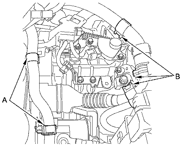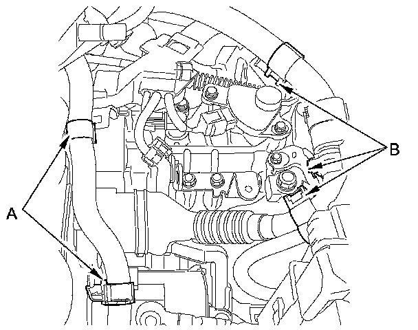7. Remove the heater hose clamps (A) and the IMA power cable clamps (B) from the bracket.