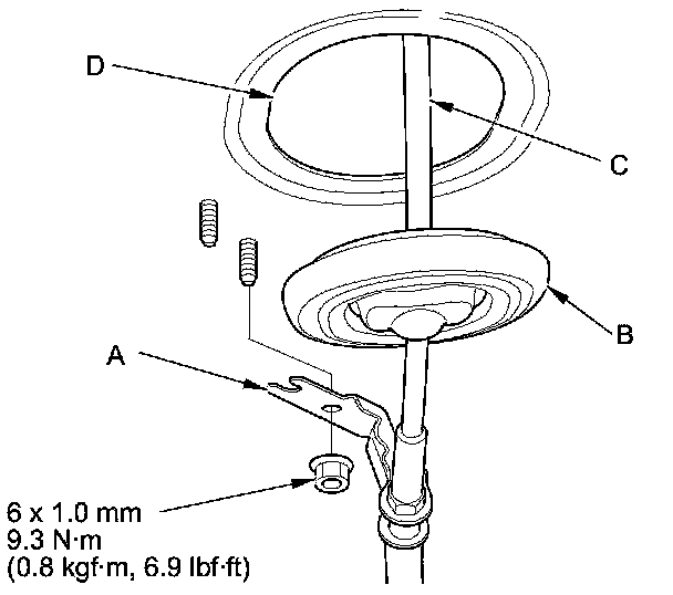 17. Insert a new shift cable through the grommet hole (D), and install the grommet in its hole. Do not bend the shift cable excessively.