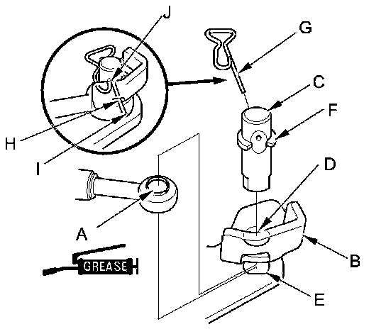23. Insert the snap pin (G) in the direction show through the control pin hole and out the opening (H) of the selector control lever so that the hooked end (I) of the snap pin snaps into the countersunk hole (J) of the control pin.