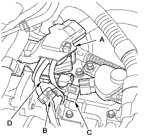 26. Connect the transmission range switch connector (C) and the CVT output shaft (driven pulley) speed sensor connector (D).