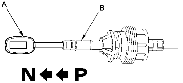 30. If necessary, push the shift cable (A) until it stops, then release it. Pull the shift cable back two steps so that the shift position is in N. Do not hold the shift cable guide (B) to adjust the shift cable.