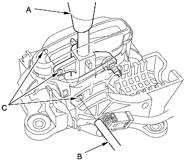 32. Place the shift lever in N (A), then insert a 6.0 mm (0.24 in) pin (B) into the positioning holes (C) on the shift lever bracket base and into the positioning hole on the shift lever. Use only a 6.0 mm (0.24 in) pin that is free of burrs.
