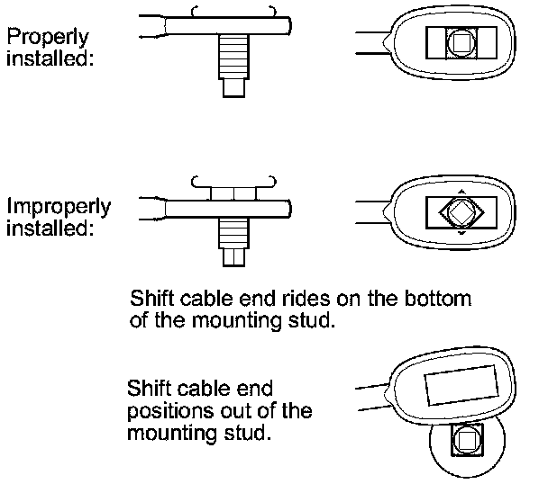 36. If the cable end is out of position on the mounting stud, remove the shift cable from the bracket, and reinstall the shift cable. Do not install the shift cable end on the mounting stud while the shift cable in on the bracket. If the cable end rides on the bottom of the mounting stud, rotate the stud and align the square fitting with the hole.