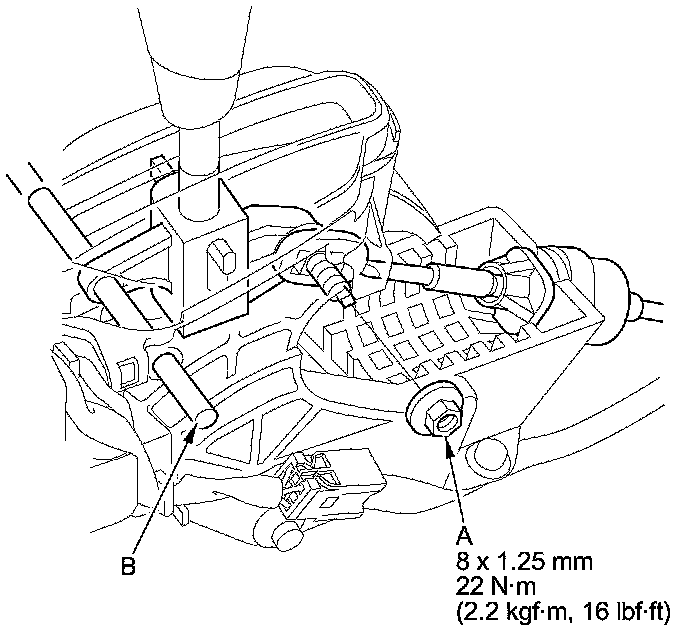 4. Remove the nut (A) securing the shift cable end (B).
