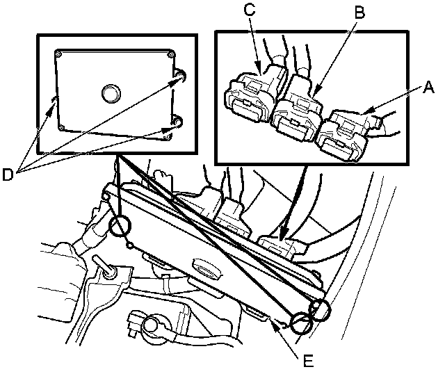4. Disconnect PCM connectors A, B, and C, then remove the PCM (E).