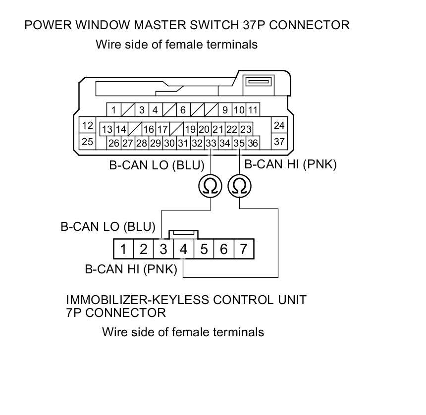 12. Check for continuity between power window master switch 37P connector terminals No. 33 and No. 35 and immobilizer-keyless control unit 7P connector terminals No. 3 and No. 4 respectively.