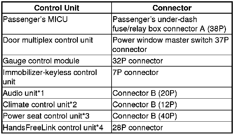 6. Disconnect the appropriate connector at each control unit in the table one at a time. Clear the DTC, then recheck for DTCs after each unit is disconnected.