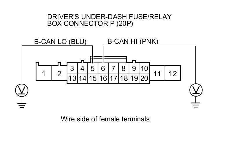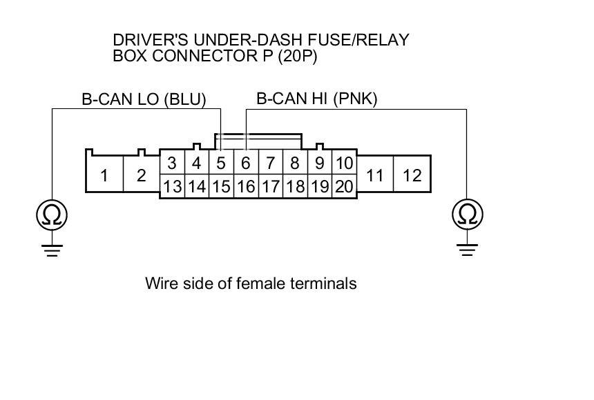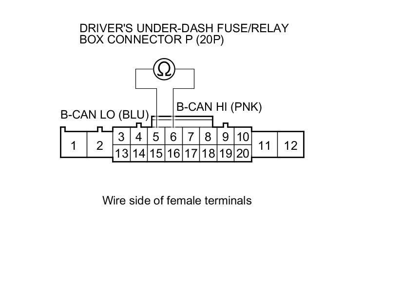 11. Check for continuity between body ground and driver's under-dash fuse/relay box connector P (20P) terminals No. 5 and No. 6 individually.