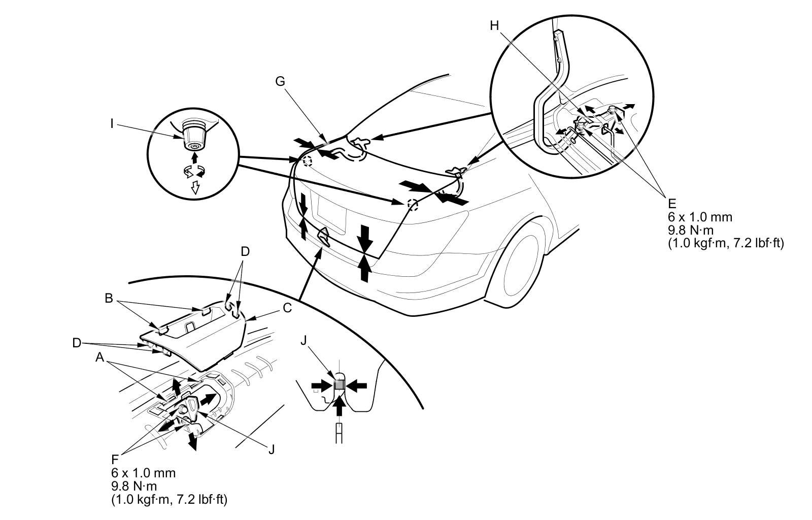 4. Adjust the trunk lid (G) alignment in the following sequence: